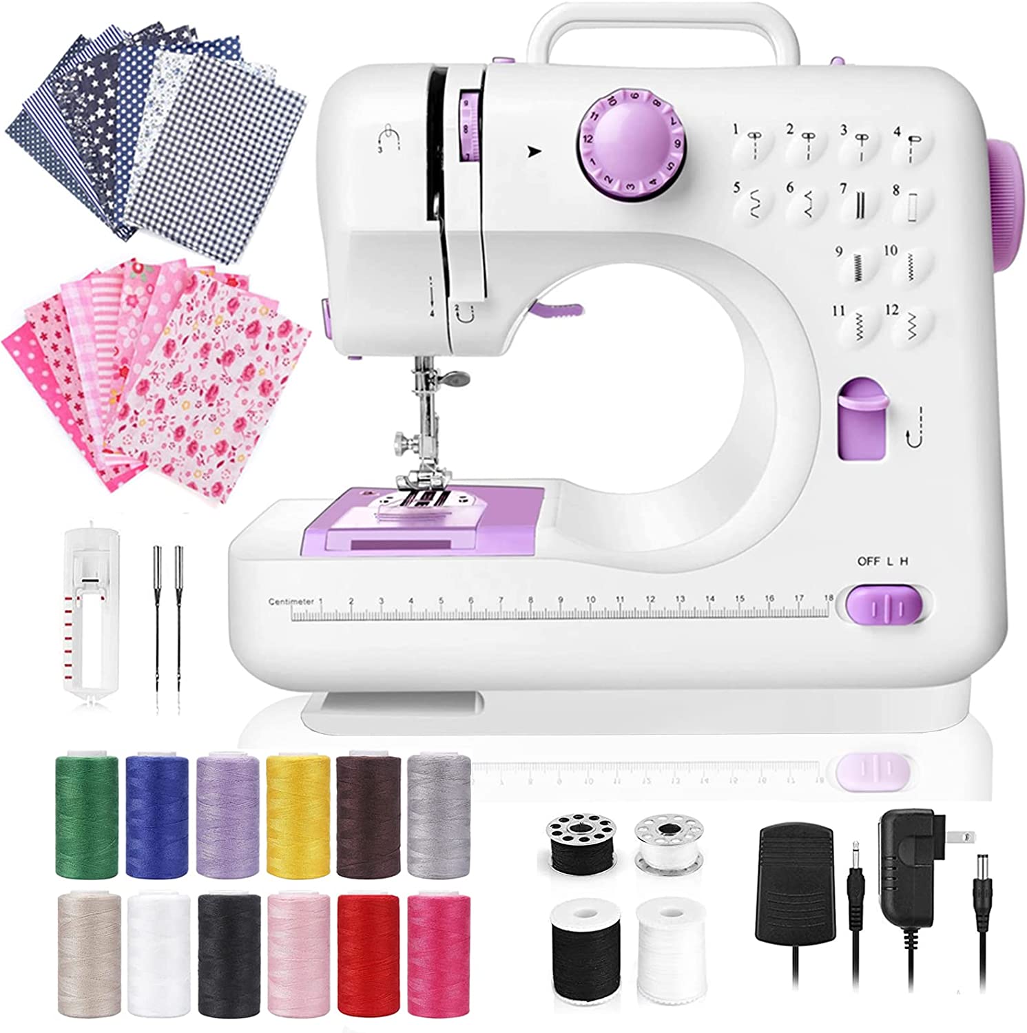 商品名Dechow Sewing Machine for Beginners, Electric Mini Portable, 12 Built-in Stitches with Reverse Sewing, 2 Speeds Double Thread with Foot Pedal, 14 Pcs Floral Cotton Fabric, 12 Colors of Polyester Sewing Threads Set 200 Yards Each(Purple)