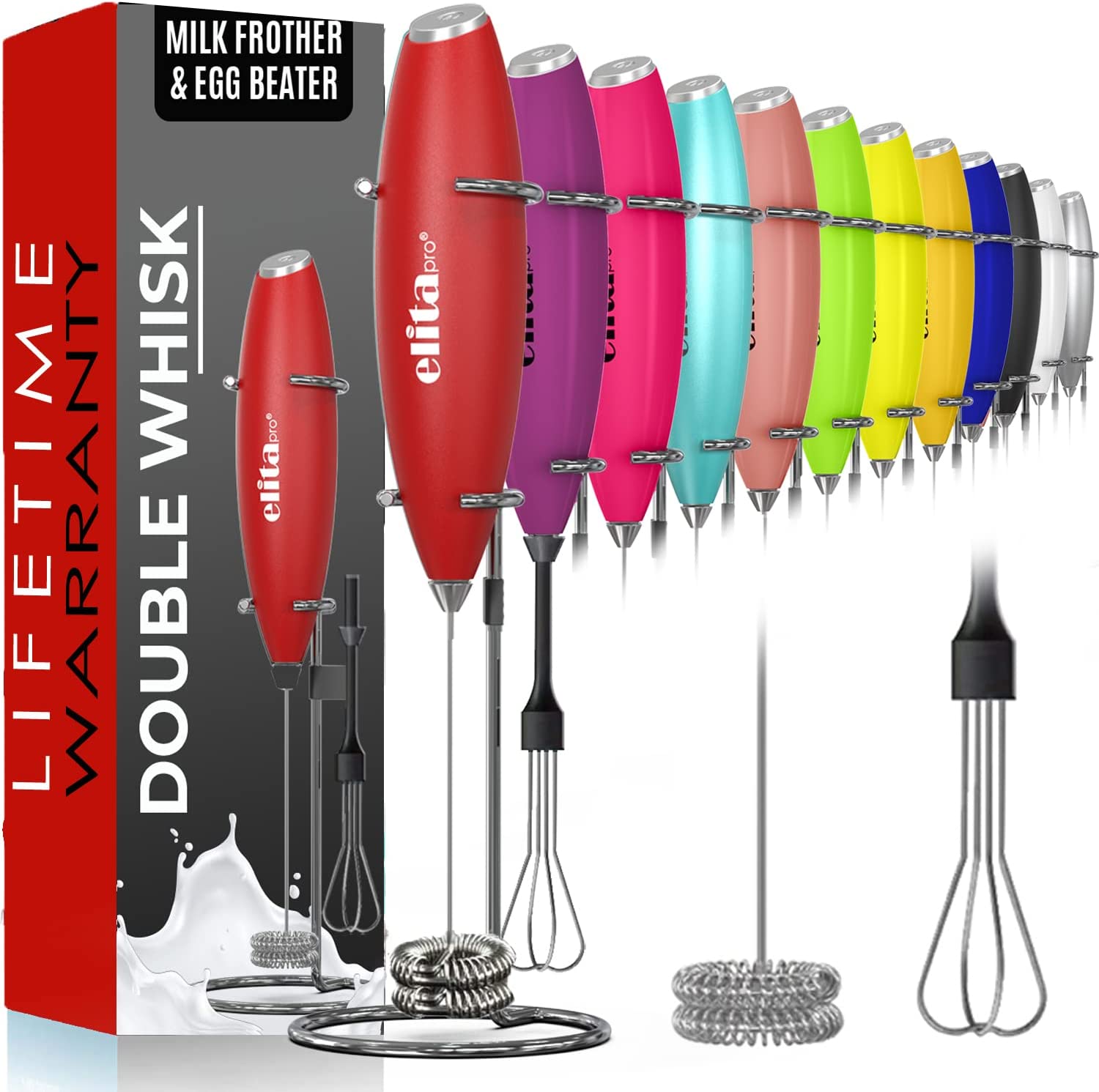 ElitaPro ULTRA-HIGH-SPEED 19,000 RPM, Milk Frother DOUBLE WHISK, Unique Detachable EGG BEATER and STAND For quick preparation (Red)