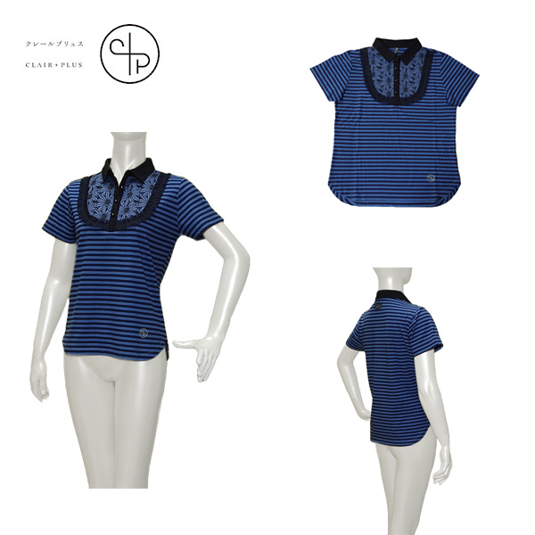 CLAIR+PLUS クレールプリュス レディース 春夏 接触冷感 ボーダー×ローンフラワーレース 半袖シャツ サイズ38
