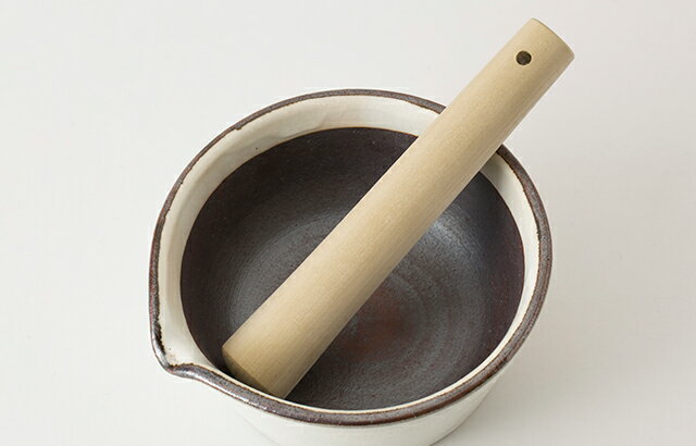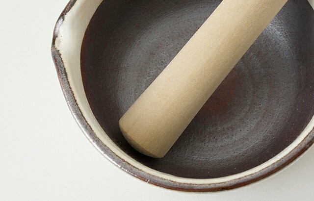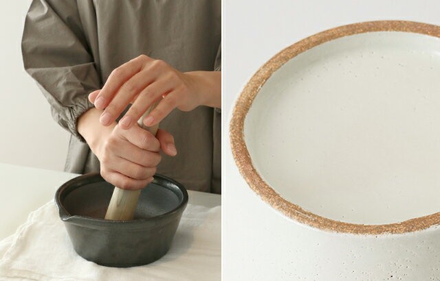 ![]() | 横広のどっしりとした土台は、表面に少しザラつきがあり、滑りにくく安定感があります。いつもなら縁を押さえて使っていたすり鉢も、両手でしっかりすり潰すことができます。 |