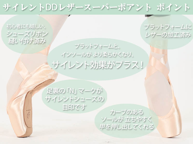 バレエ トウシューズ サイレントDDレザースーパーポアント 初心者からプロまで トゥシューズ リボン付き すべり止め付き 消音