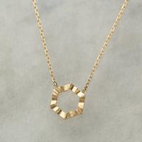 | 波目のような凸凹が個性的な六角形モチーフ。 滑らかな肌触りで、まるでシルクを思わせる柔らかい輝きを放つネックレス。 オープンな六角形モチーフは抜け感があり、重たい印象とは程遠く、デイリーに着用できるデザインです。 |