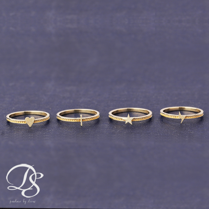 | ミルグレイン(ミル打ち)のリングにスターダスト加工されたモチーフがキラリと光る、大人可愛いリング。 |