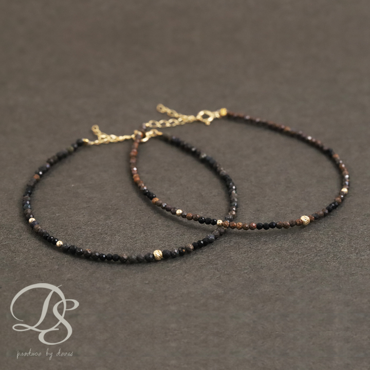 | 「 STONE BRACELET 」 ボルダーオパールとブラックオパールを使った天然石ブレスレット。 18金のパーツが上品に輝き、カジュアルながらも、洗練された大人向けのブレスレットです。 約2mm〜2.5mmのパールをベースに、オニキスを散りばめた、細めのブレスレットは上品な印象です。 小さな天然石に手作業で施されたカットが、光を反射して輝き、落ち着いた色合いで肌馴染みもよく、普段使いにぴったり。 2サイズ展開に加えて、3cmのアジャスターチェーン付きで、サイズが不安な方やギフトの場合でもご安心いただけます。 1本でももちろん、腕時計や様々なアクセサリーとのコーディネートをお楽しみください。ペアブレスレットとしてもおすすめです! お取り扱いについて 当ブレスレットは、比較的強度のあるワイヤーを採用しておりますが、より永くお使いいただきたく、ご使用時の主なご注意点を3つご紹介いたします。 (1) ワイヤー伸び ワイヤーコードの特性上、瞬間的な力に対してはもちろん、圧力・引っ掛けなどで徐々に力が加わり伸びてしまう場合があります。 特に、就寝時や洋服脱着時などでも、無意識に引っ掛け・引っ張られが発生し、負荷が掛かる可能性があり注意が必要です。 当店にて様々なワイヤーの比較検証を行った上で、現状のワイヤーコードを採用している為、基本的には負荷が掛かった場合にはすぐ切れる事はなく、徐々に伸びていく仕様となっております。 (2)着用する際に 本来の形状から反対方向に曲げるのはもちろん、同じ方向にも 出来る限り力を加えず、手首に添ってのみ曲げ着用ください。少しの力でも何度も圧力が加わる事で切れる原因となりますので、お取り扱いには充分にご注意ください。 (3)水濡れを避ける 手洗い程度は構いませんが、プールやお風呂など、長時間水に触れてしまうのはお避けください。ワイヤー切れ・石の破損・変色などの原因となります。 また、石の破損や欠けなどにより、ワイヤー部分が見えてきてしまう場合もあります。 |