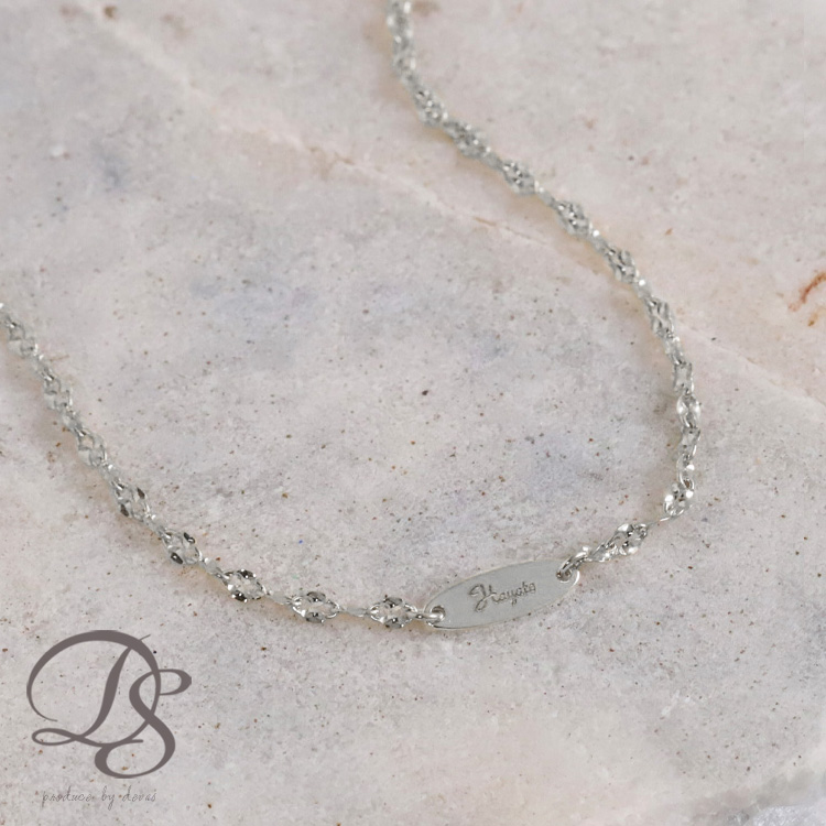 | 全体としてさりげないサイズ感で、あえて主張しすぎないデザイン。 チェーンとは差別化し、プレートはシンプルに鏡面仕上げで、だからこそ目を引かれる。 デザインはさりげなくとも、大切な刻印はしっかり刻み込みます。 |