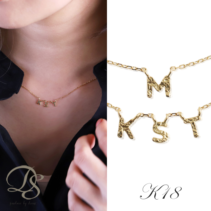 近くで見ないと分からない程小さなイニシャルモチーフを用いたK18ゴールドネックレス。