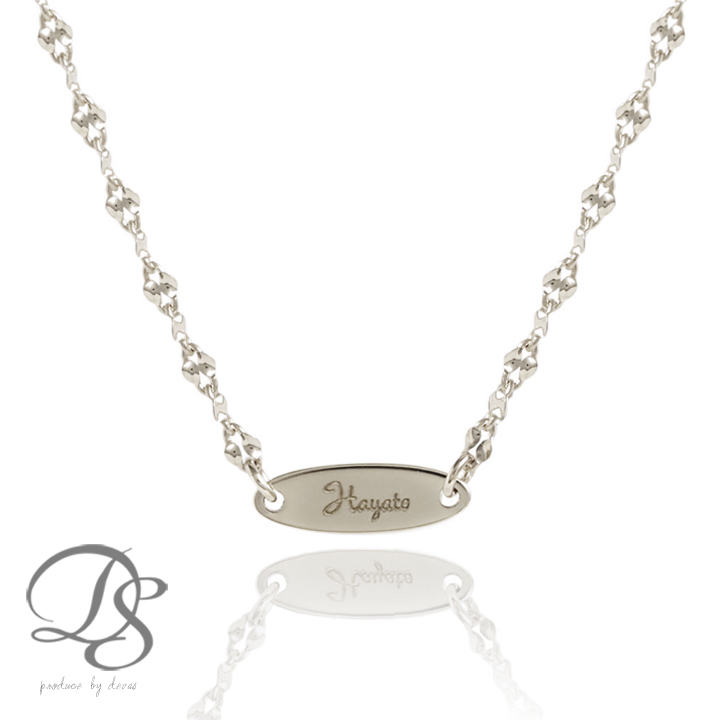| 全体としてさりげないサイズ感で、あえて主張しすぎないデザイン。 チェーンとは差別化し、プレートは表裏共にシンプルな鏡面仕上げ。だからこそ目を惹かれる。 デザインはさりげなくとも、大切な刻印はしっかり刻み込みます。 |