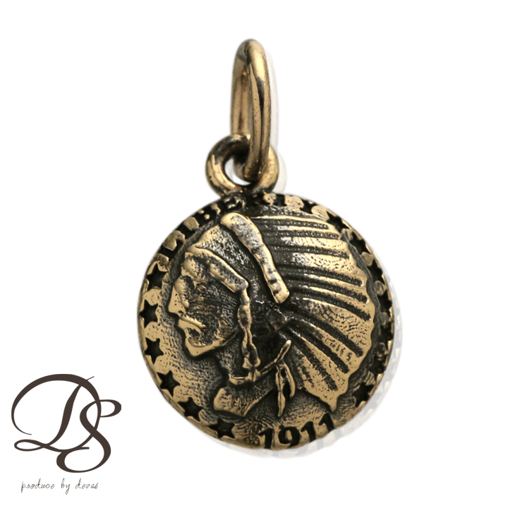 | コインペンダントの中に浮かぶ立体的なインディアン、外側に並んだスターなど細部までこだわり抜いたデザイン。 さらに独特な風合いが目を引き、存在感もばっちりです。 |