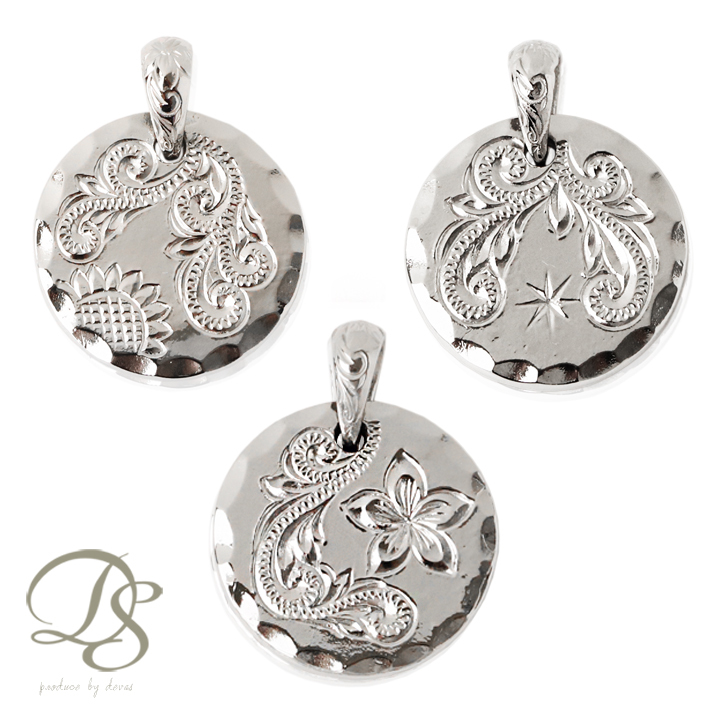 ハワイアンジュエリーの彫り模様が施されたコイン型のプラチナペンダントトップ。