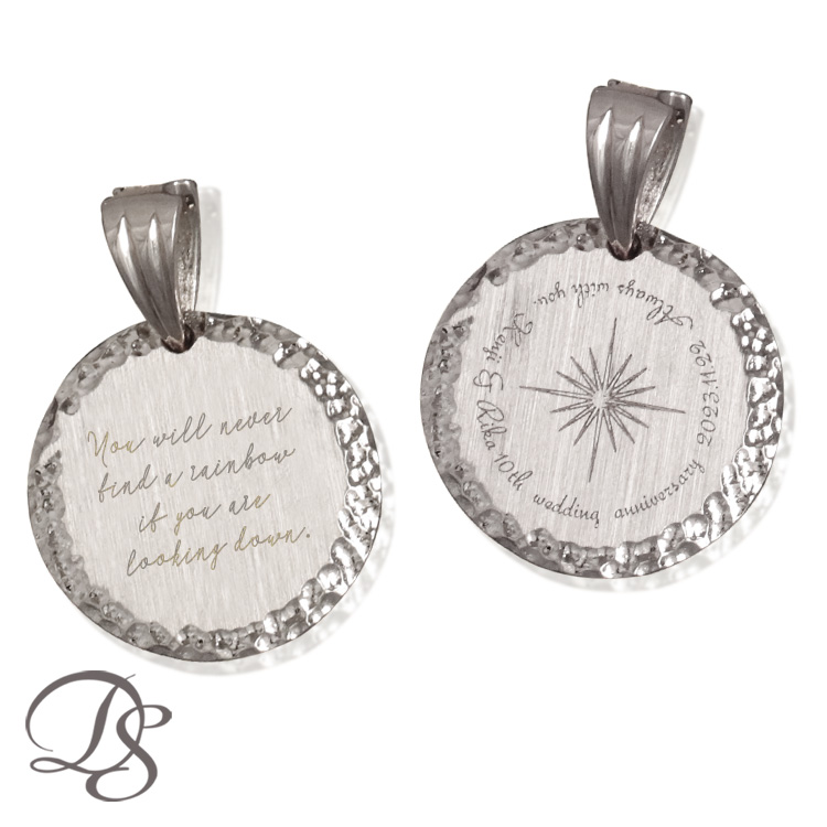 | 胸元をラグジュアリーに装う、ボリューム感あるLサイズ。1円玉をほんの少し小さくしたくらいのサイズ感は男女問わず身につけられる大きさ。刻印面積が広い分、想いを込めた絵柄やメッセージも余裕を持って詰め込むことが出来ます。 |