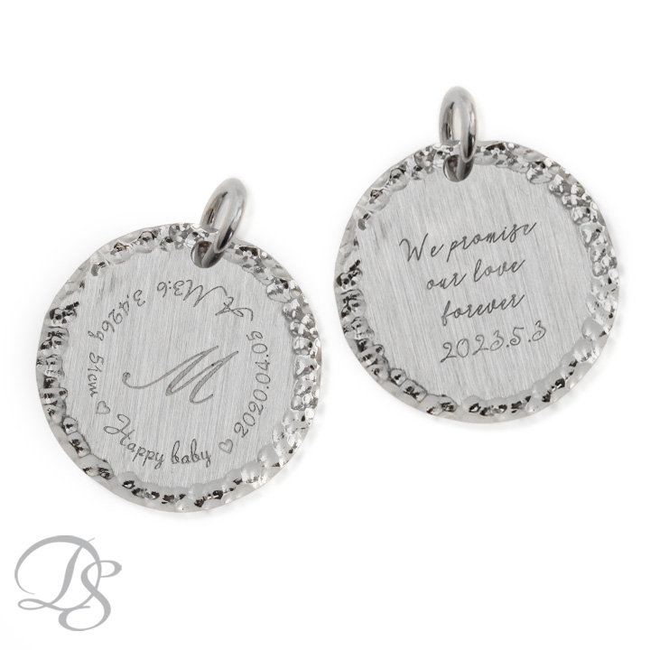 | イニシャル、数字、絵柄、メッセージなど幾通りにも組み合わせてできる刻印ペンダント。 大切な人のイニシャルやラッキーナンバー、出産や結婚などの記念日や記録を刻んだメッセージなど、大切な想いを込めたあなただけの一生物のオリジナル作品を完成させてください。 |