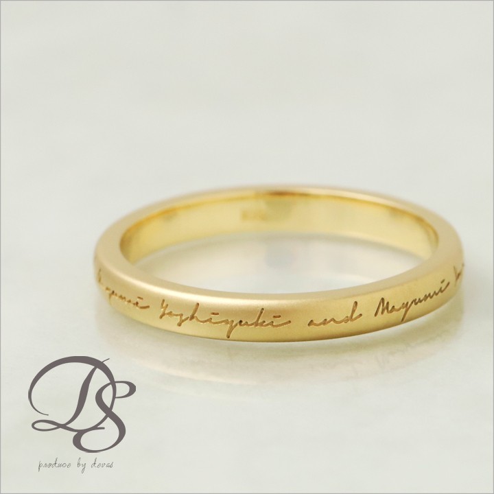 | ■サイズ 幅2.5mm(仕上げにより多少誤差が生じます) 厚み1.8mm ■展開サイズ 1号・2号・3号・4号・5号・6号・7号・8号・9号・10号・11号・12号・13号・14号・15号・16号・17号・18号・19号・20号 サイズにお悩みの方はこちら ■素材 K18 [ゴールド/ピンクゴールド/ホワイトゴールド(コーティングなし)] プラチナ(Pt.950) ※無垢 (中空ではありません) ※ニッケルフリー(ニッケルは含まれておりません) ■ご注意点 ・お届け後のサイズ交換について 完全受注生産品のため、商品お届け後の無料サイズ交換はお受け出来かねます。商品の構造上、新たに一から商品をお作りする事となります。お作り直しの代金につきましては、その都度お見積もりをさせていただきますので、ご希望の際は、まずは当店までご連絡くださいませ。 また、サイズが変更になると、当初のリングと比べ刻印文字数が増減し、終わりの文字が変わる可能性が御座います。職人が1点1点商品を仕上げている関係上、当初お届けした商品よりも、文字間などが当初のリングと異なる場合が御座います。ただし、出来る限り当初と同じ仕上げとなるよう対応致します。 ・しばらくご利用後にサイズお直しする場合(マット加工の場合) 使用感がある場合は、新品交換後に見た目(輝き具合)が異なり、マットっぽい印象に戻る場合が御座います。 マット仕上げの場合、通常使い込んでいく内にマット感が薄れ、少し光沢感が強くなってくる仕様のためです。 商品について、少しでもご不安な点やお悩みなど御座いましたら、info-y@devas.co.jp よりお気軽にお問い合わせくださいませ。 ■関連商品 同リングの2mm幅はこちら |