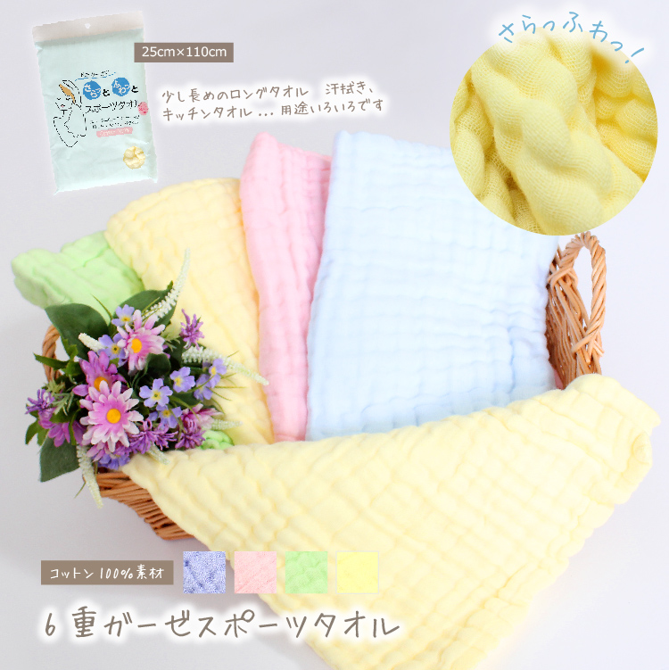 ガーゼ スポーツ タオル スポーツタオル ガーゼタオル フェイスタオル 髪拭きタオル バスタオル 6重 6層 6重ガーゼ 6層ガーゼ 子供 大人 汗拭き 無地 生地 プレゼント かわいい てぬぐい 手ぬぐい 手拭い 手拭 TENUGUI サックス ピンク グリーン イエロー