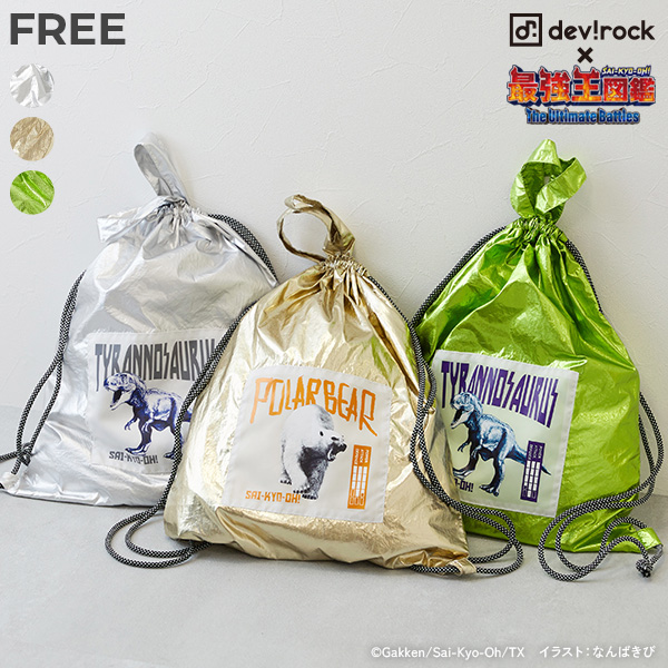 | トレンド感のある『最強王図鑑コラボ メタリック ナップサック』 メタリック素材のナップサックに、ティラノサウルス・ホッキョクグマがデザインされたおしゃれアイテム。 ランドセルの上からも背負えるので、お着替えを入れて通学時に使用するのもおすすめです。 |