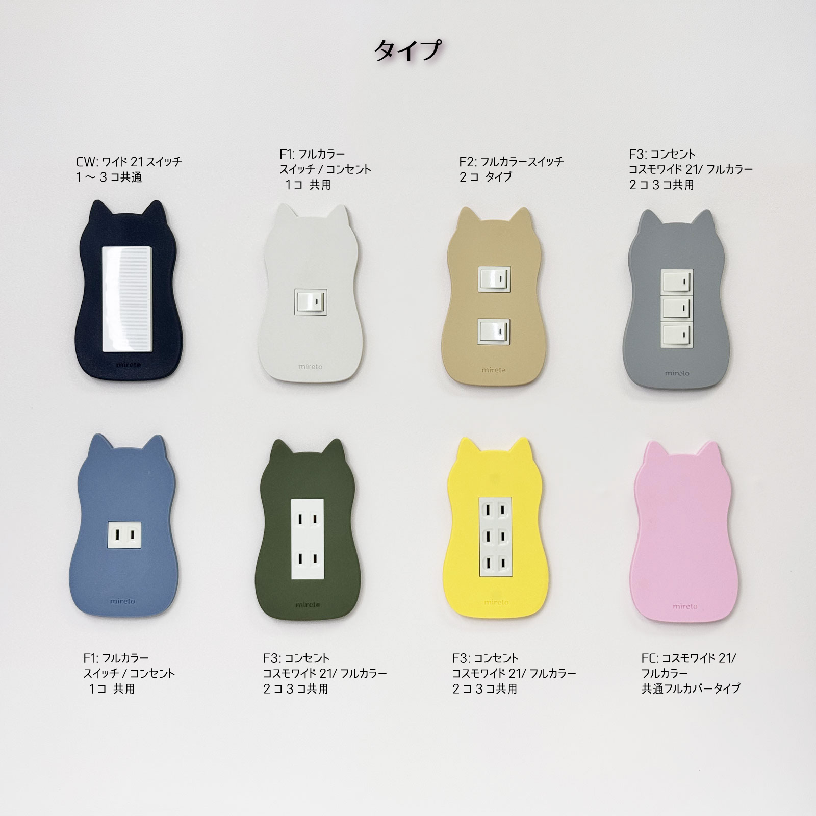 | 対応種類 | パナソニックのスイッチ・コンセントのコスモシリーズワイド21とフルカラーでお使いただけます。 CW:コスモワイド21 スイッチ1〜3コ共通 F1:フルカラースイッチ/コンセント 1コ 共用 F2:フルカラースイッチ 2コ タイプ F3:コンセント コスモワイド21/フルカラー2コ3コ共用 FC:コスモワイド21/フルカラー共通フルカバータイプ |