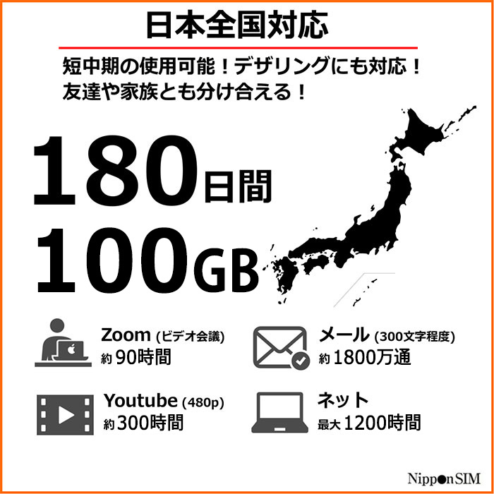 180日間 100GB、NTTドコモの通信網で広範囲の高速通信!ご購入のデータ容量を使い切っても、180日間は最大速度128kbpsでご利用可能です。