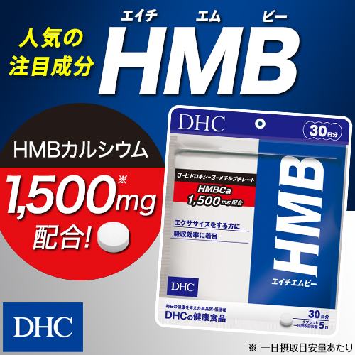 HMB(3-ヒドロキシ-3-メチルブチレート)は、エクササイズをする方に人気の注目成分! DHCの『HMB(エイチエムビー)』は、[HMBカルシウム]を1500mg(※1)配合。牛肉約1.7kgに含まれるHMB(※2)を1日5粒で効率よく摂取することができます。