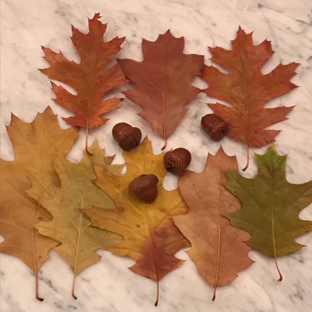 令和元年10月作成の特大レッドオークの帽子付きどんぐり4個 & 押し葉8枚。