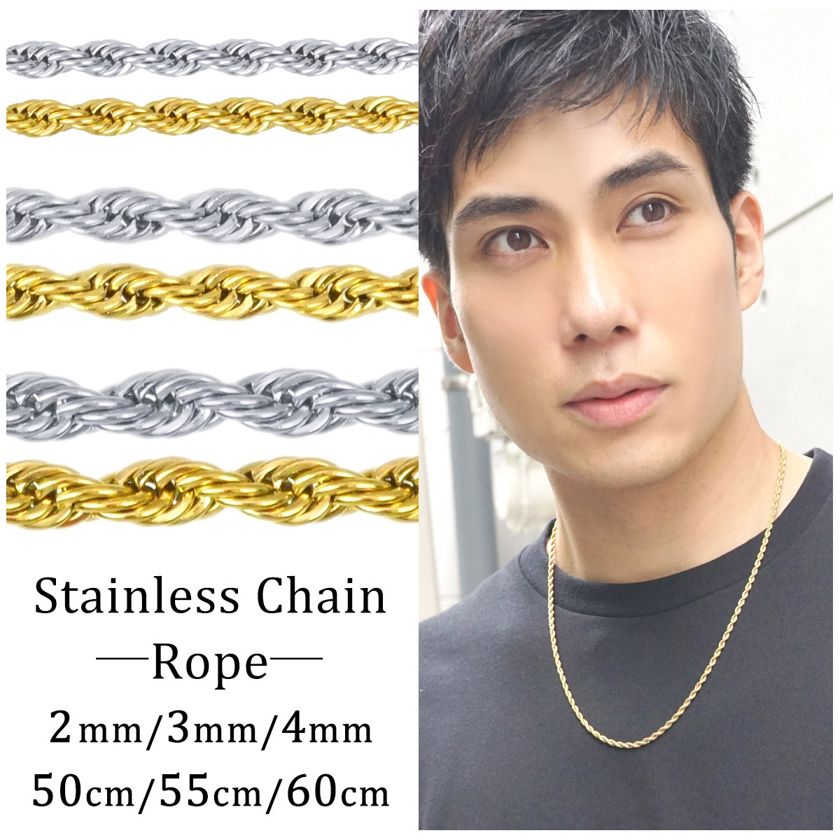 人気のロープチェーンを使用したネックレス。シンプルでどんなスタイルにも相性が抜群。ゴールドカラーには18金ゴールドコーティングが施されております。