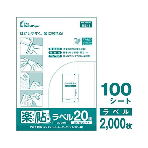 商品名:楽貼ラベル 20面 用紙サイズ:A4 シート枚数:100枚/冊 ラベルサイズ:42×74.25mm ラベル枚数:2000枚 坪量:147g/m2 紙厚:0.14mm ISO白色度:90% 対応プリンター:マルチ対応 (インクジェットプリンター/レーザープリンター/コピー機) お問い合せNo.:RB15