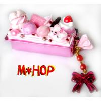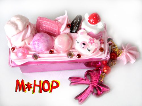 デコ雑貨 手作りスイーツ盛り フリスクケース シュークリームEチャーム付 ・手作りシュークリーム/手作りクッキー/くまたん/手作り2色アイス/パール/アクリル/いちごケーキ/ビーズ/シリコン等で仕上げてあります。 チャームには、手作りホイップ&アクリルリボン&2連パール
