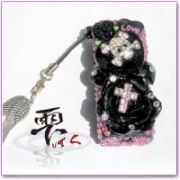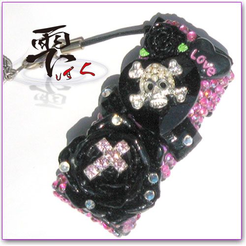 小悪魔系 ブラック&ピンクのボーダー デコライターケース チャーム付 デコ製品 by-雫 ■ 裏面はストーンでデザインしてあります。 使用パーツ :: プラバラ、メタルスカル、キュービックジルコニアクロス、オーバル&ハート&スクエアストーン、高品質ストーン、プラパーツ等々 ※使い捨てライターケースとなっております。