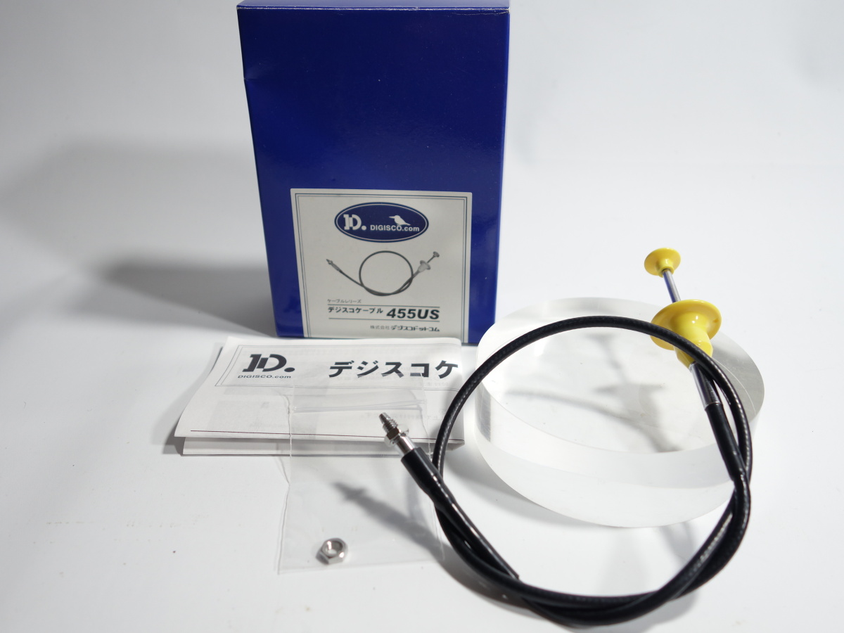 長さ45cmの少し固めのしっかりしたケーブルです。デジスコのハードな使用に耐えられるようにケーブル全体に熱シュリンクチューブで補強カバーをしました。これによりレリーズチップ上部での折れ曲がりが保護され、しかも全体的に大きな曲率で保持されるので耐久性が一気に向上しています。デジスコでは使用しないレリ−ズのロック機構は省きました。先端のチップは従来品のデジスコケーブル505と同様、レリーズタップとM5ネジのコンボです。