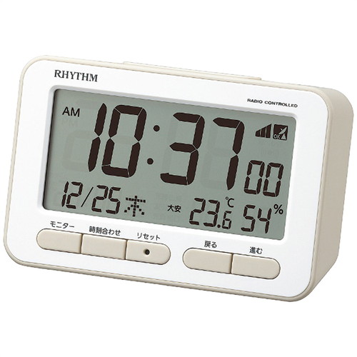 見やすい大きめのLCD(液晶)と柔らかいフォルムが特徴の電波デジタルめざまし時計です。