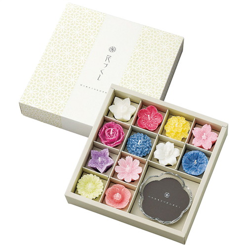 日本を代表する12種類の花々をかたどったフローティングキャンドル。グラス付ですのですぐにお使い頂けます。植物由来原料を使用し、やわらかな色合いとそれぞれの花の香りが楽しめます。セット内容:花づくし(植物性)12種各1個、グラス1個。