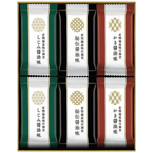 ■味付海苔(しじみ醤油味)(8切4枚)・味付海苔(秘伝醤油味)(8切4枚)・味付海苔(かき醤油味)(8切4枚)各6袋