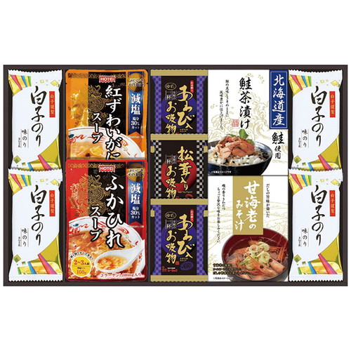 ■ふかひれスープ160g・紅ずわいがにスープ160g・松茸入お吸い物4.2g各1袋・あわび入お吸い物4g×2袋・白子のり(8切5枚)4袋・甘海老のみそ汁(7.5g×3袋)・北海道産鮭茶漬け(4g×3袋)各1箱