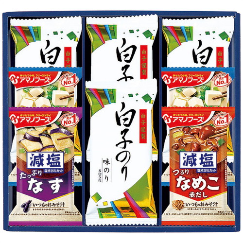 アマノフーズの減塩タイプみそ汁と白子のり味のりを詰合せました。