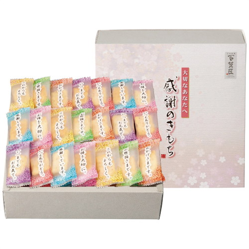 普段言葉では言い表せない「感謝のきもち」を個包装にデザインしました。中身はソフトに焼き上げておりますので幅広い年代の方に召し上がっていただけます。