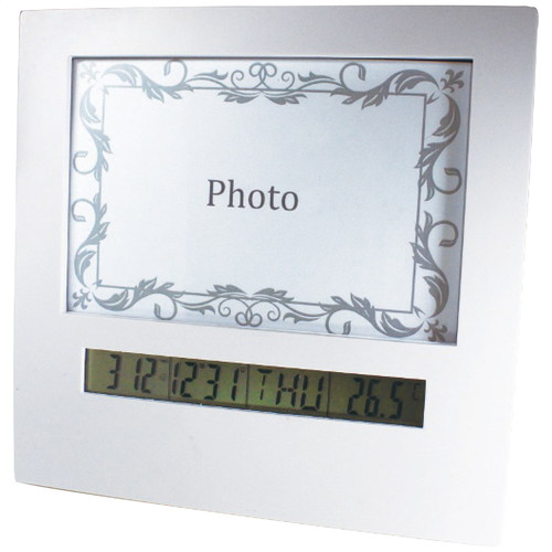 アラーム付き時計とフォトフレームがついたペンスタンド。カレンダー、時計、温度計、アラーム。写真サイズ15×10cmポストカードサイズ対応。