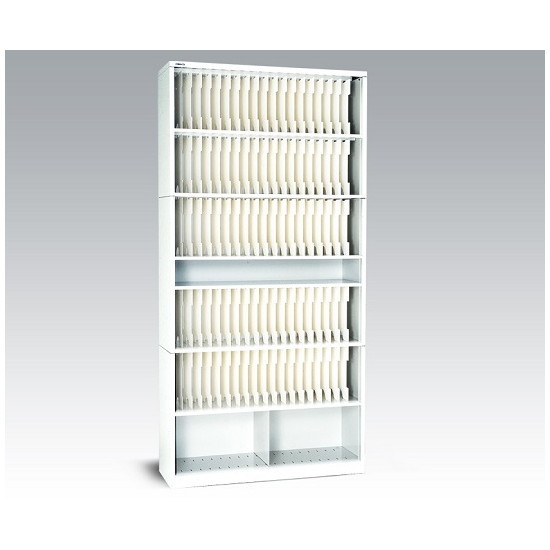 ●組み立て式(要工具)ターミナル・デジット方式とは1.カルテの末尾番号2桁、00から99までの番号を用いたカルテ管理方法です。2.100区画されたカルテ専用ラックを使用し、最上段左端の区画から右へ順に00・01・02・03…と末尾番号を設定します。3.最下段右端の最終区画は99となり、3桁に位があがる100番は、末尾が00なので一番始めの区画に戻ります。4.これを繰り返すことにより、収容物の検索は末尾番号2桁で分類されて総数の100分の1となります。