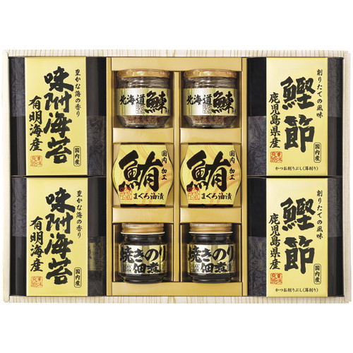 ■北海道産鰊フレーク50g・焼きのり佃煮85g・鹿児島県産鰹節(2g×3)・有明海産味附海苔(8切10枚)・まぐろ油漬け70g×各2