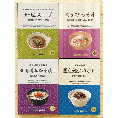 北海道からの贈り物和の美味しさにこだわった和風ギフトセットです。北海道産の秋鮭使用、昆布とかつおだしの-北海道秋鮭茶漬け-、北海道の昆布と鰹だしの効いた上品で旨味たっぷりのとろろ昆布と海藻入り-和風とろろ昆布海藻スープ-、鰹と昆布、あさりから取っただしに、桜えびをまるごと入れた風味豊かな-桜えびみそ汁-国内で水揚げされた鰹に味と香りのよい国産海苔を合せた-国産鰹ふりかけ-小分けの袋に入って使い易い、和の美味しさが詰まったセットです。もらって嬉しい魅力的なギフトです。和をモチーフした北海道らしいデザインになっております。