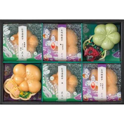 香ばしい最中種に滋味調整した具材を合わせたお茶漬と京野菜お吸物の詰合せ。お茶・お湯を入れるだけで簡単に上品な京風お茶漬・お吸物になります。