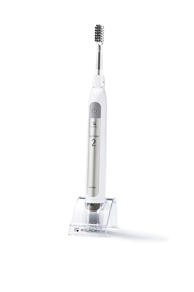 こびりついた歯のよごれを除去して、そのあと一晩じゅう細菌を寄せつけない。SOLADEY RHYTHM 2(ソラデーリズム2)の特徴は、音波と電子のチカラを駆使して歯のつるつるを持続させる、今までにない歯ブラシ。