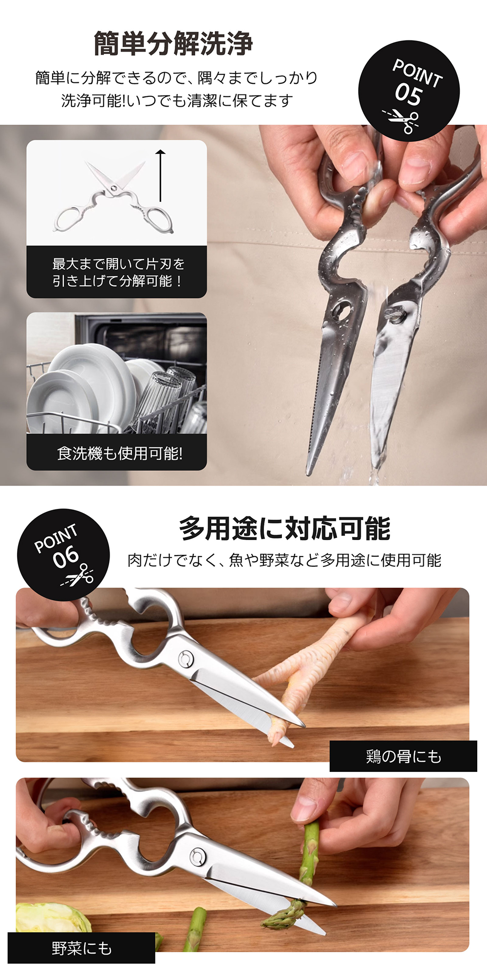 | 【万能機能・分解洗浄】 | 多機能で実用的な便利ツールこのハサミはまさにキッチンのスイスアーミーナイフ!切るだけでなく、栓抜きや缶切りとしても使える万能選手。さらに分解して洗えるので、細部まで清潔に保てるのが最高です。衛生面でも満点! |