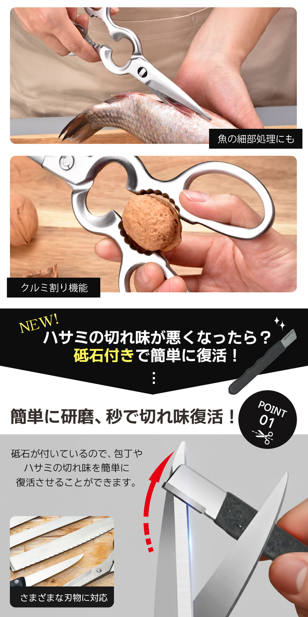 | 【選ばれる理由】 | 鋭い切れ味の切削の達人キッチンハサミがついに正式発売!ギザギザの刃が食材をまるで外科医のメスのように美しく切り分けます。高硬度ステンレス製で、まさに「キッチンのウルヴァリン」。硬い肉の筋や骨、乾物までも軽々と切り裂く、切削界の万能チャンピオンです。 |
