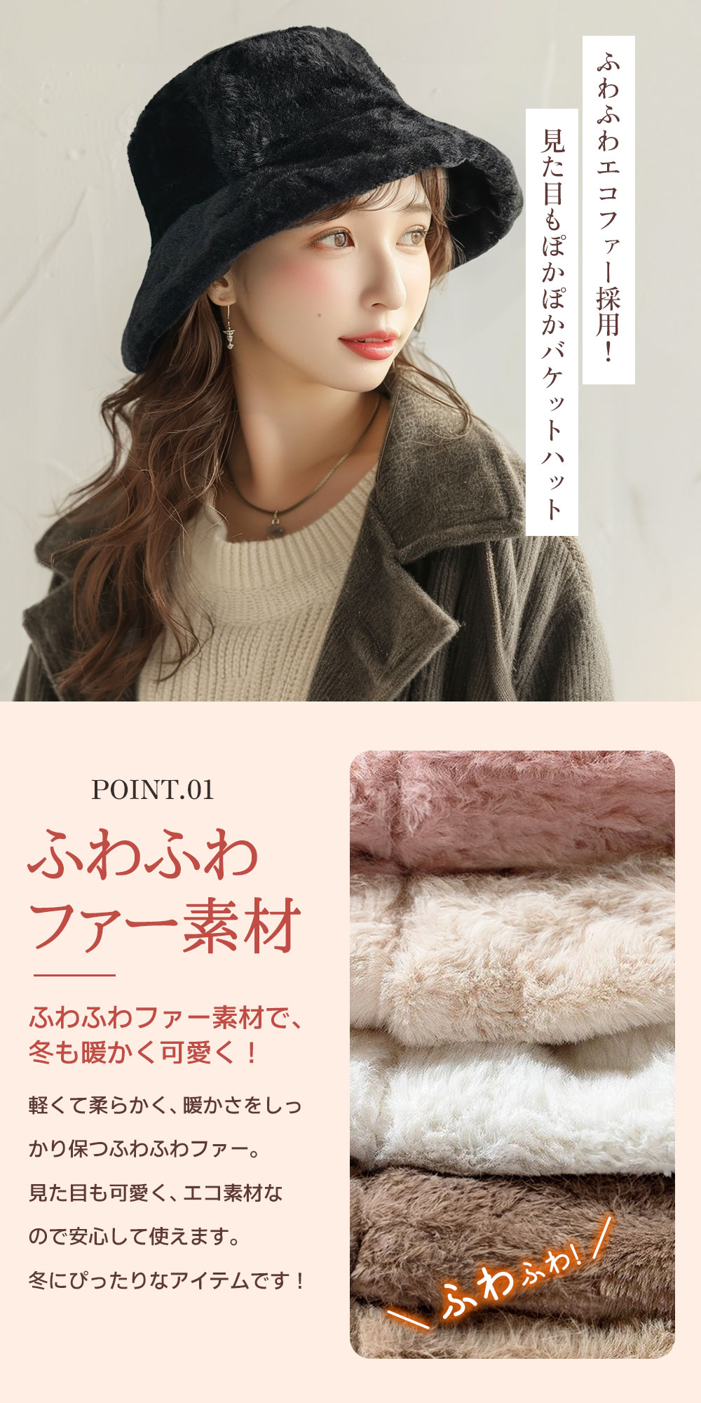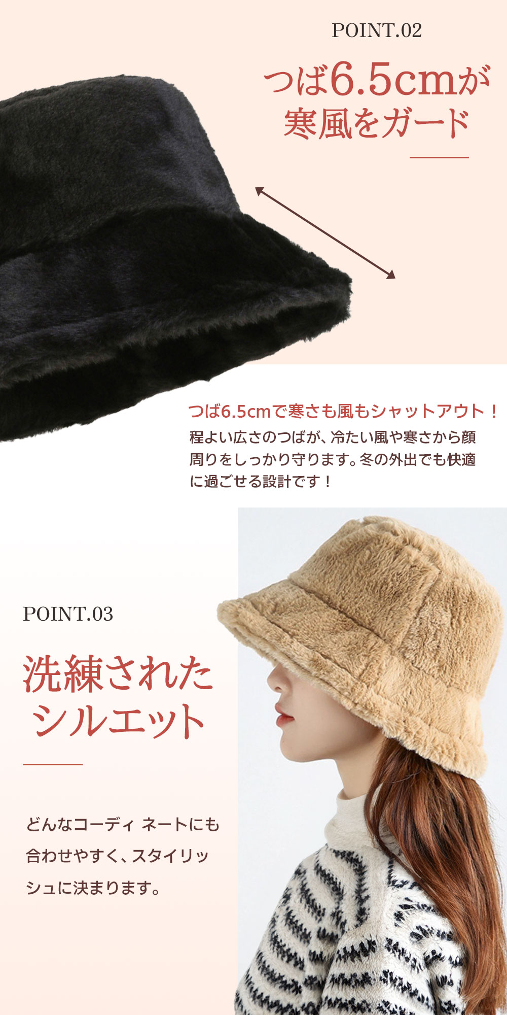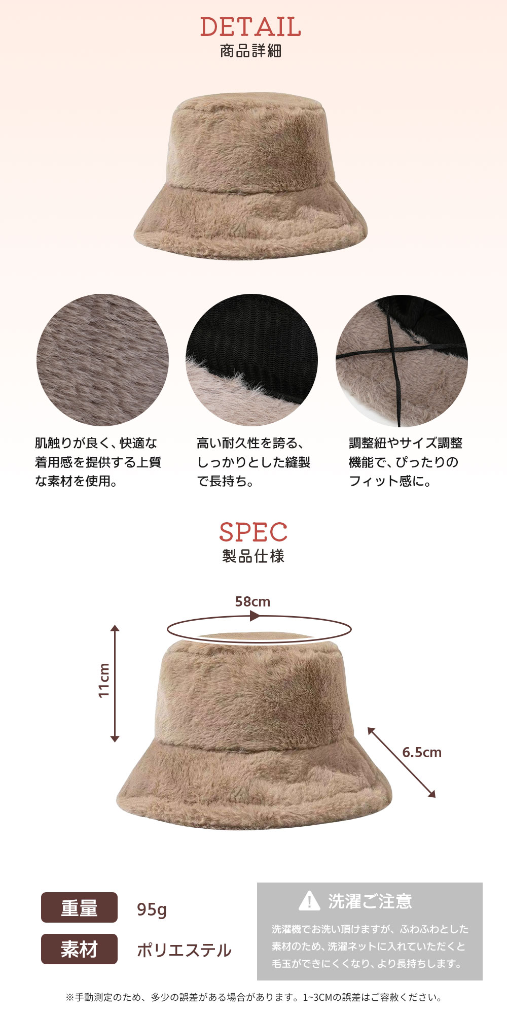 | 【魅力的なデザインと質感】 | ふわふわした手触りのファー素材使用、トレンド感のあるバケットハットスタイルで、女性らしい雰囲気を演出 |