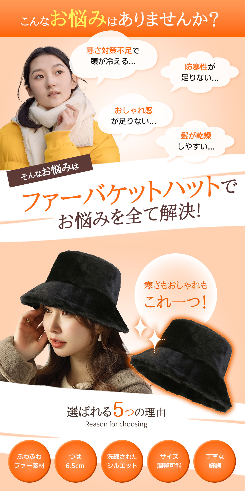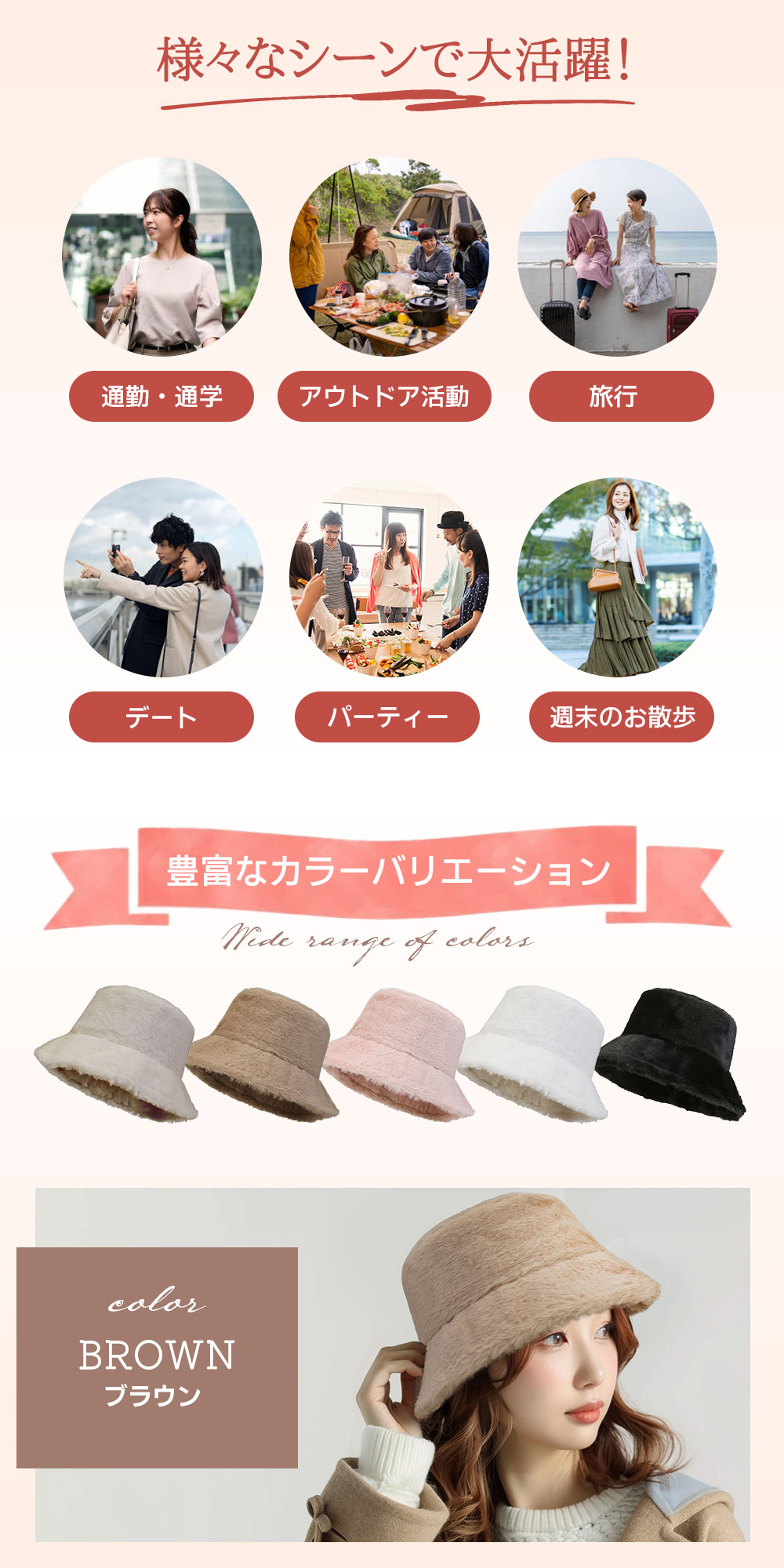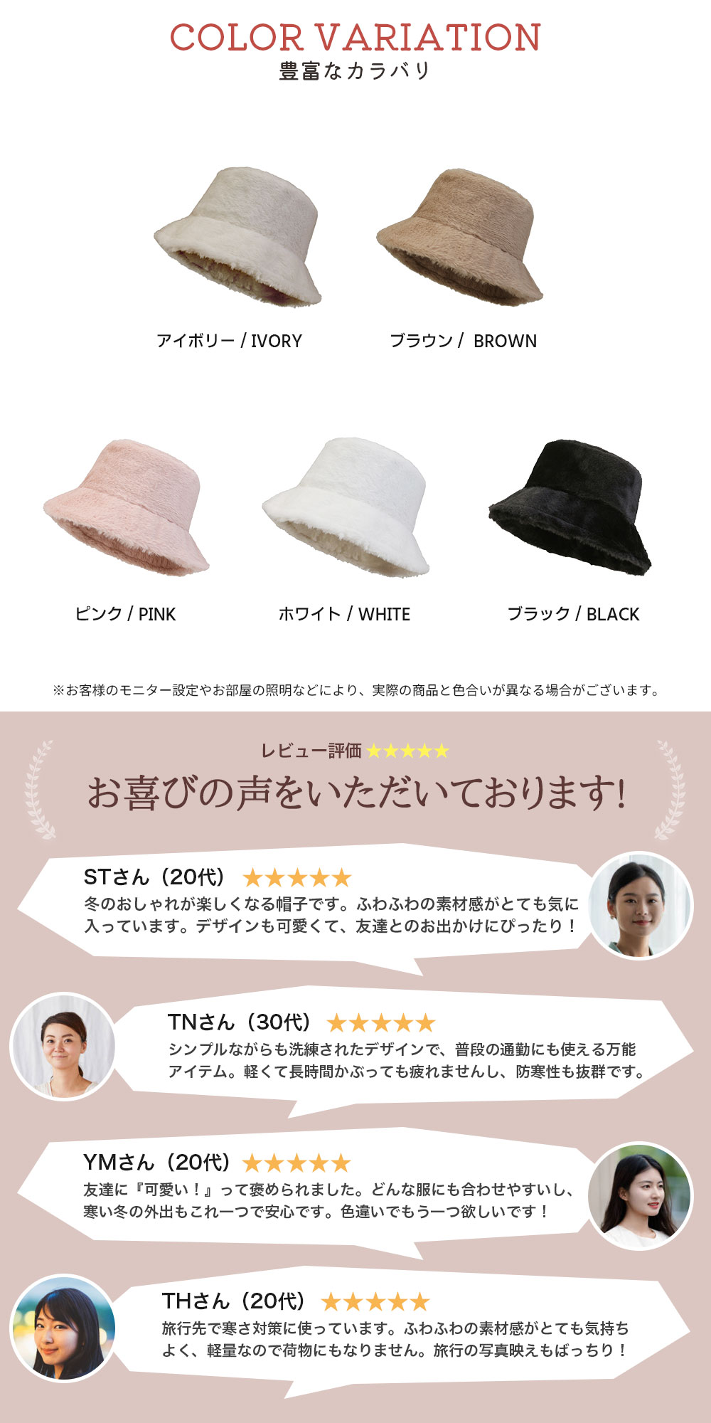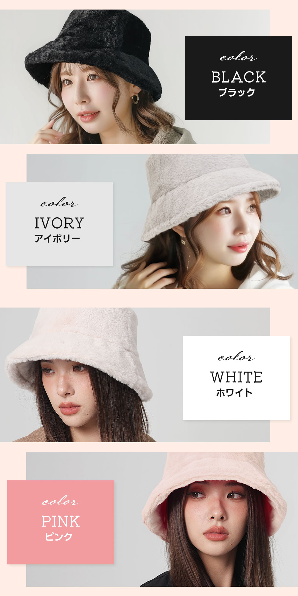 | 【魅力的なデザインと質感】 | ふわふわした手触りのファー素材使用、トレンド感のあるバケットハットスタイルで、女性らしい雰囲気を演出 |