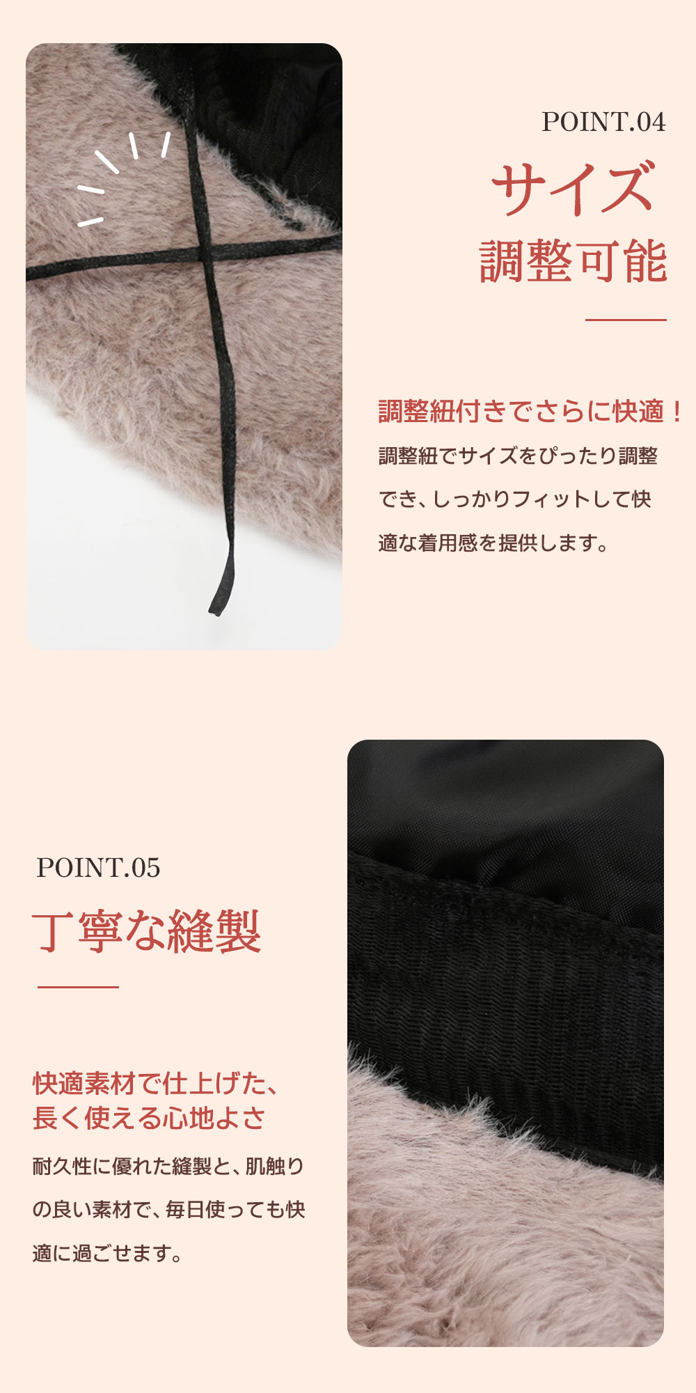 | 【優れた防寒性能】 | ウサギ混紡素材の起毛生地を採用し、蓄熱性と保温性に優れた設計。裏地は通気性のある素材で蒸れにくく、快適な着用感を実現 |