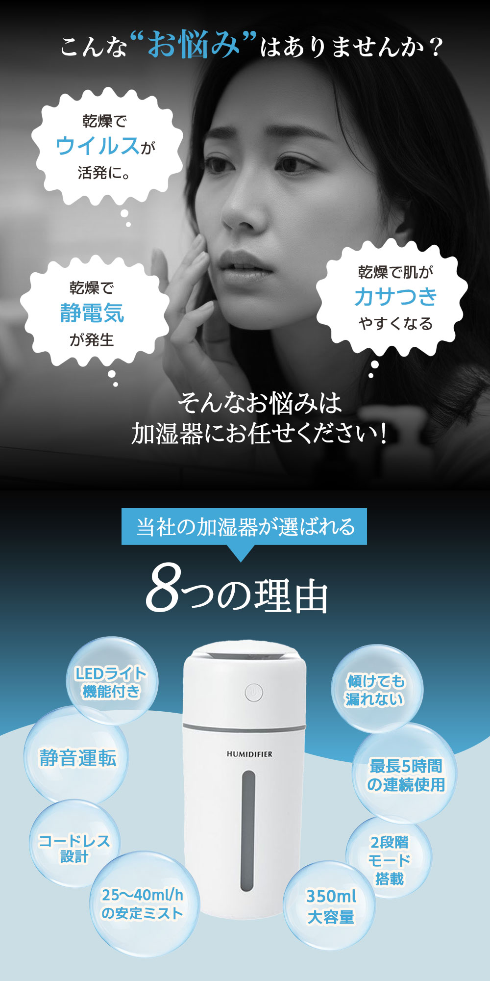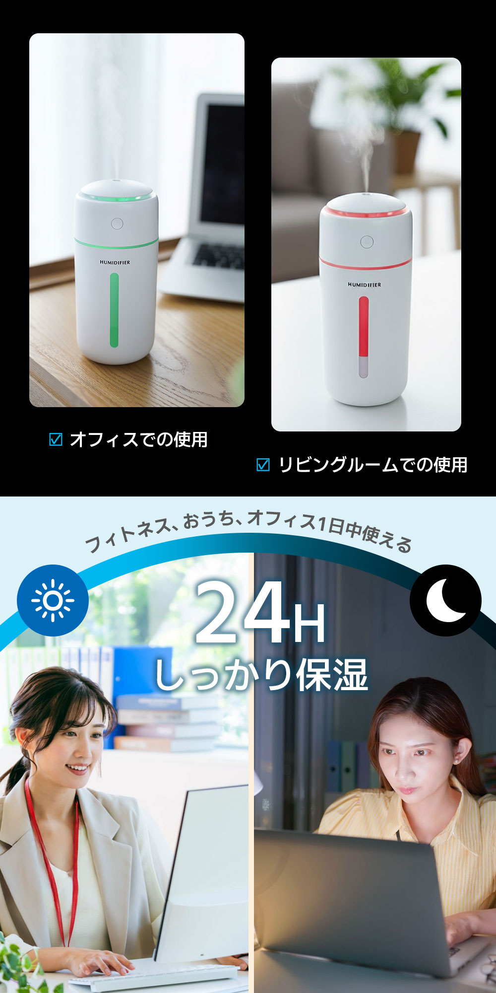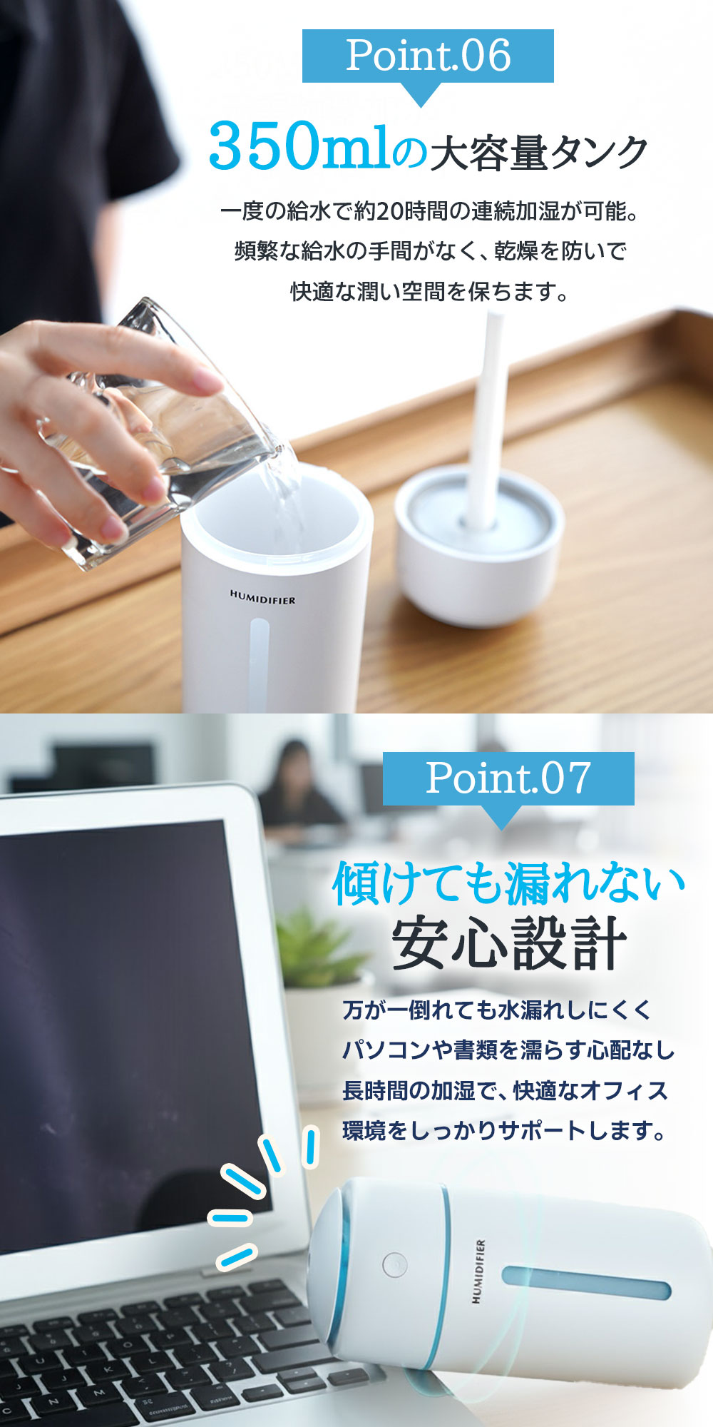 | 【350mlの大容量タンクで長時間加湿】 | 一度の給水で最長5時間の連続加湿が可能。こまめな給水が不要で、寝ている間も安心して使えます。乾燥を防ぎ、快適な空気をキープ。 |