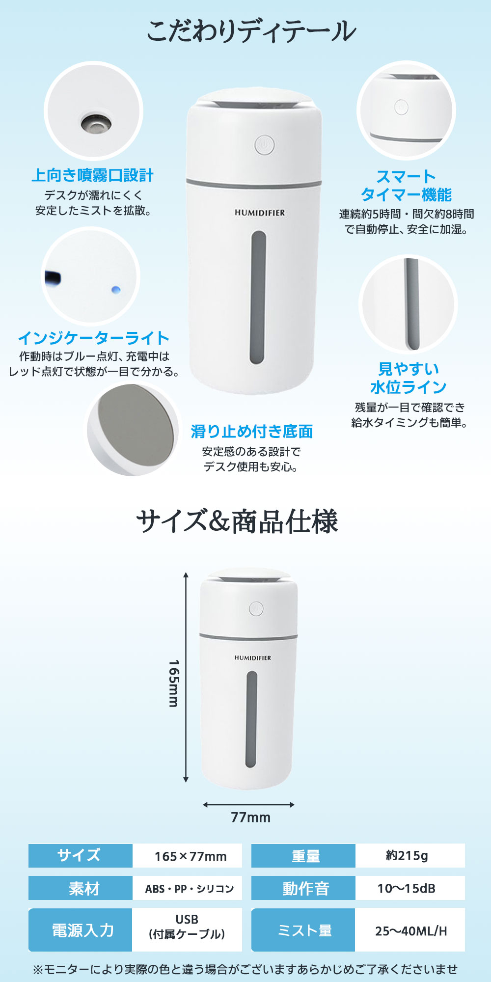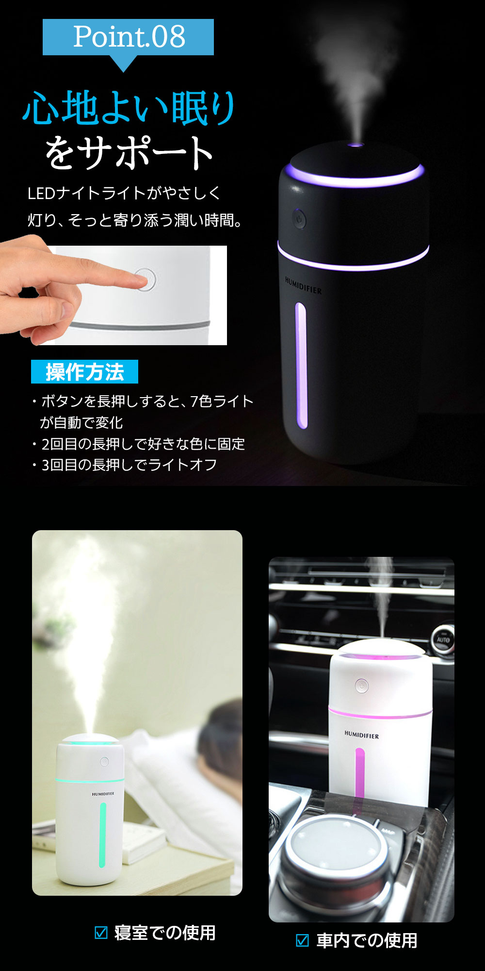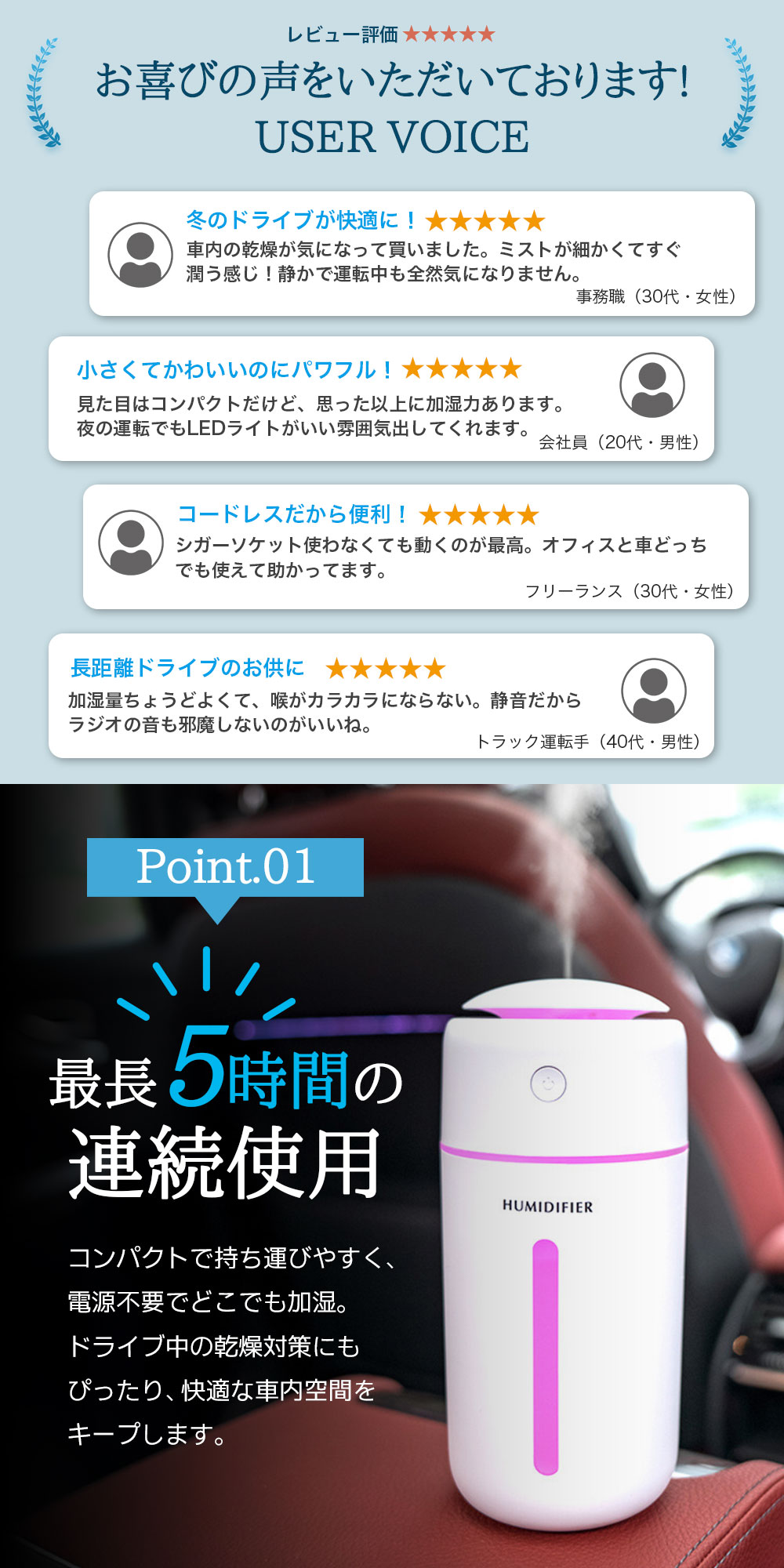 | 【350mlの大容量タンクで長時間加湿】 | 一度の給水で最長5時間の連続加湿が可能。こまめな給水が不要で、寝ている間も安心して使えます。乾燥を防ぎ、快適な空気をキープ。 |