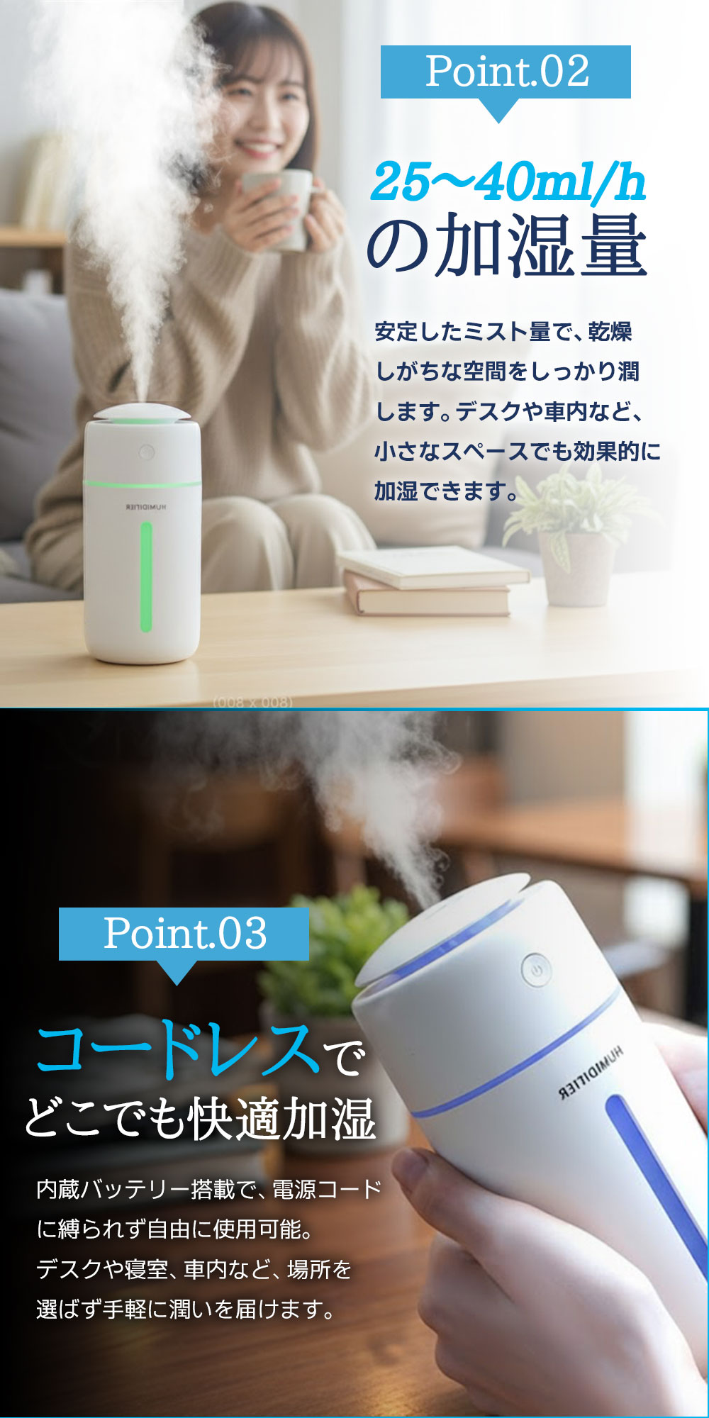 | 【コードレス設計でどこでも加湿】 | 内蔵バッテリー搭載で電源コードに縛られず、寝室・オフィス・車内・リビングなど、どこでも自由に使えます。乾燥が気になる季節に手軽にうるおいをプラス。 |