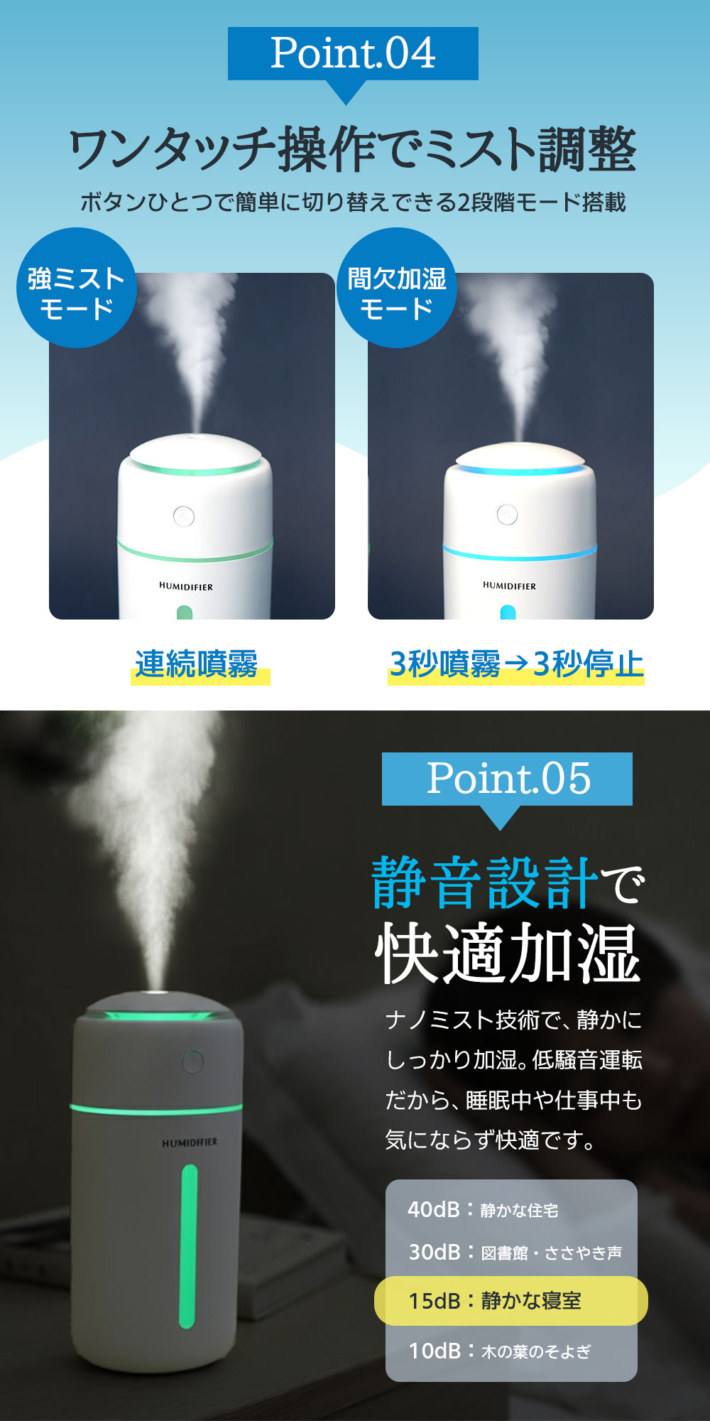 | 【静音運転で快適な眠りをサポート】 | 稼働音はわずか10〜15dB。ナノミスト技術でしっかり加湿しながらも静かに運転。就寝中や仕事中でも気にならず、リラックス空間を演出します。 |