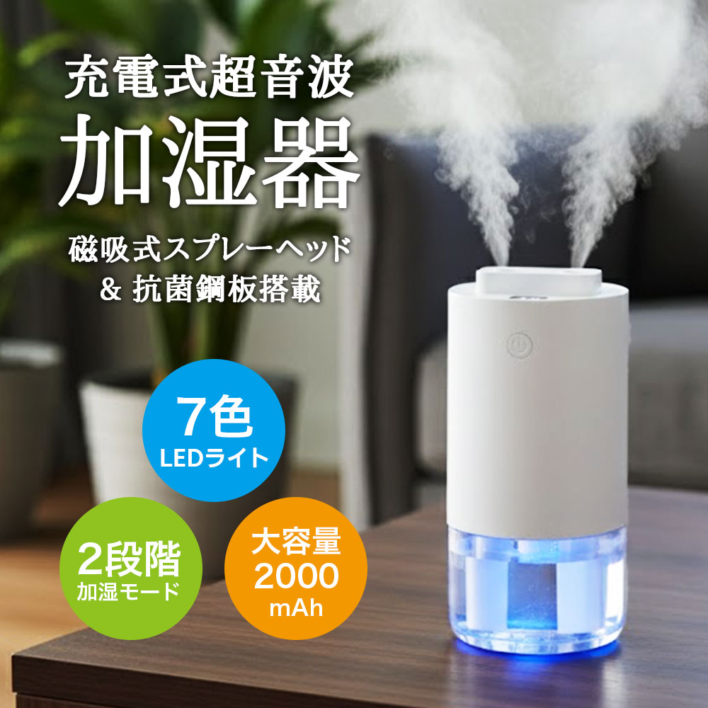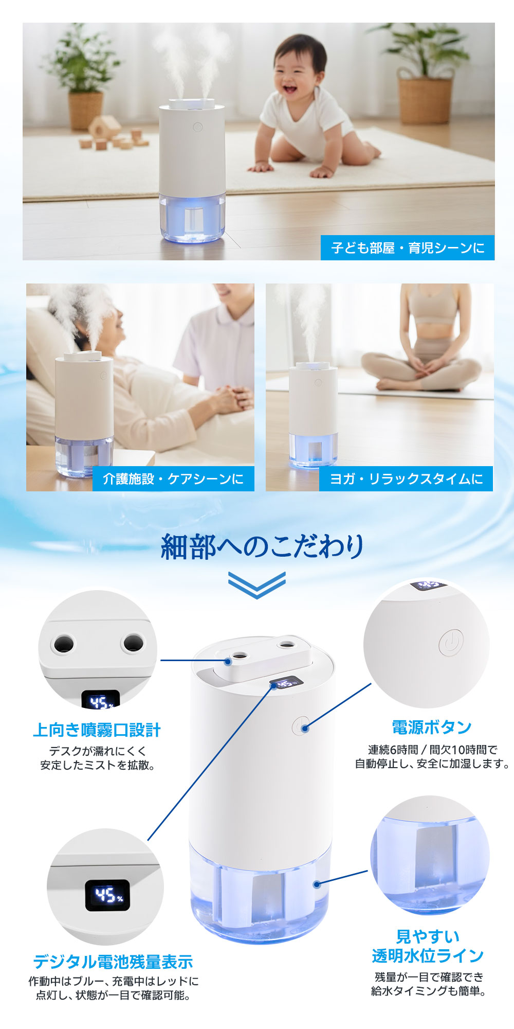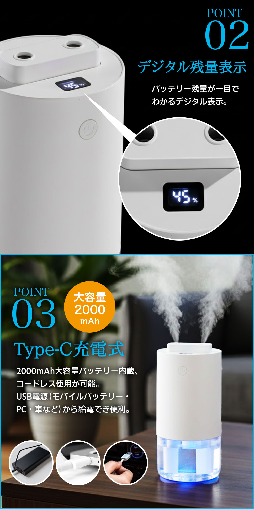 大容量2000mAhバッテリー内蔵で、コードレスでどこでも加湿可能。USB電源(モバイルバッテリー・PC・車内電源など)から手軽に充電でき、旅行やオフィスでも大活躍。