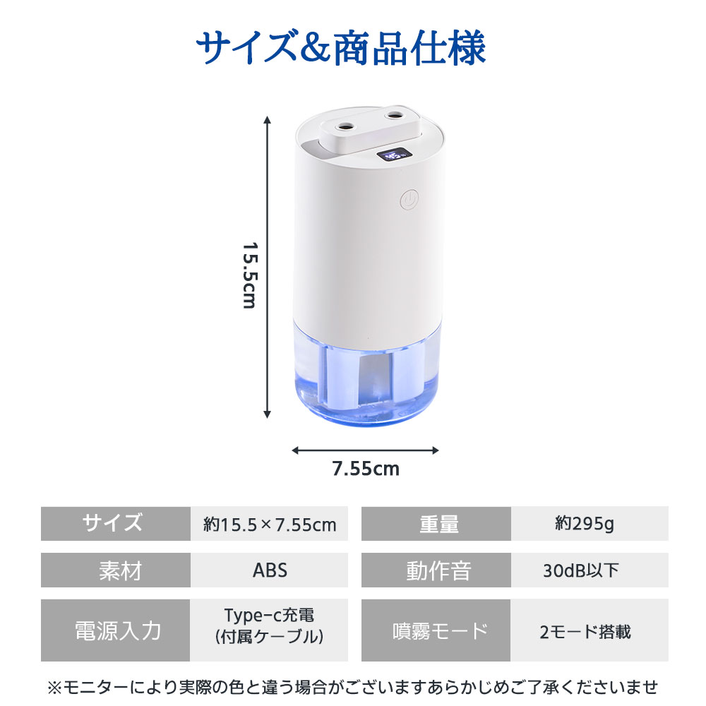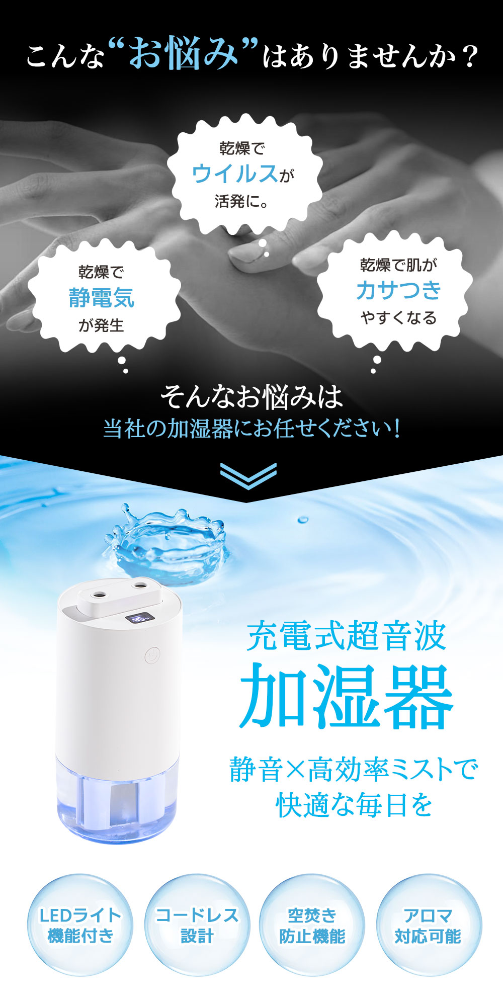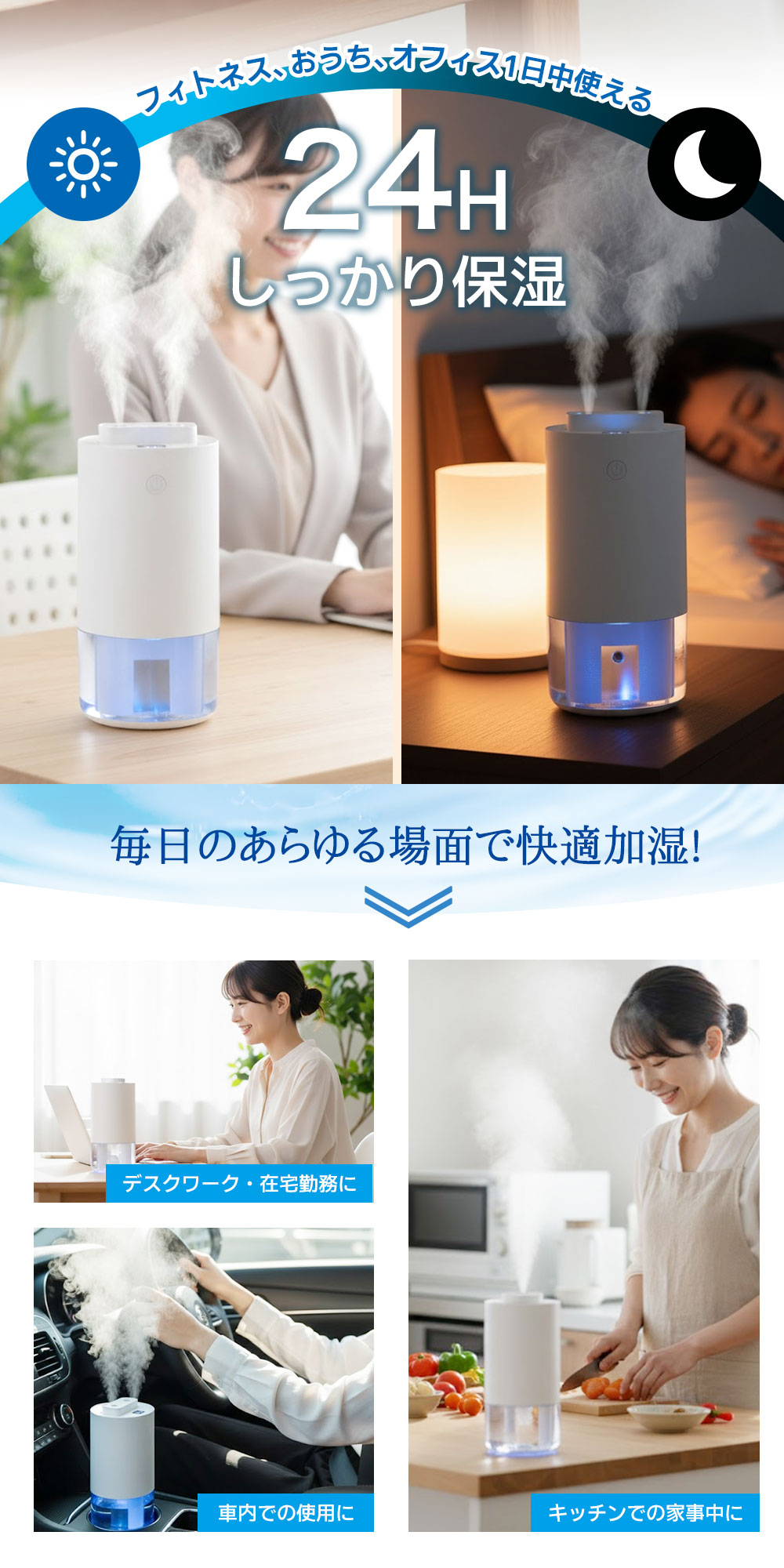 大容量2000mAhバッテリー内蔵で、コードレスでどこでも加湿可能。USB電源(モバイルバッテリー・PC・車内電源など)から手軽に充電でき、旅行やオフィスでも大活躍。